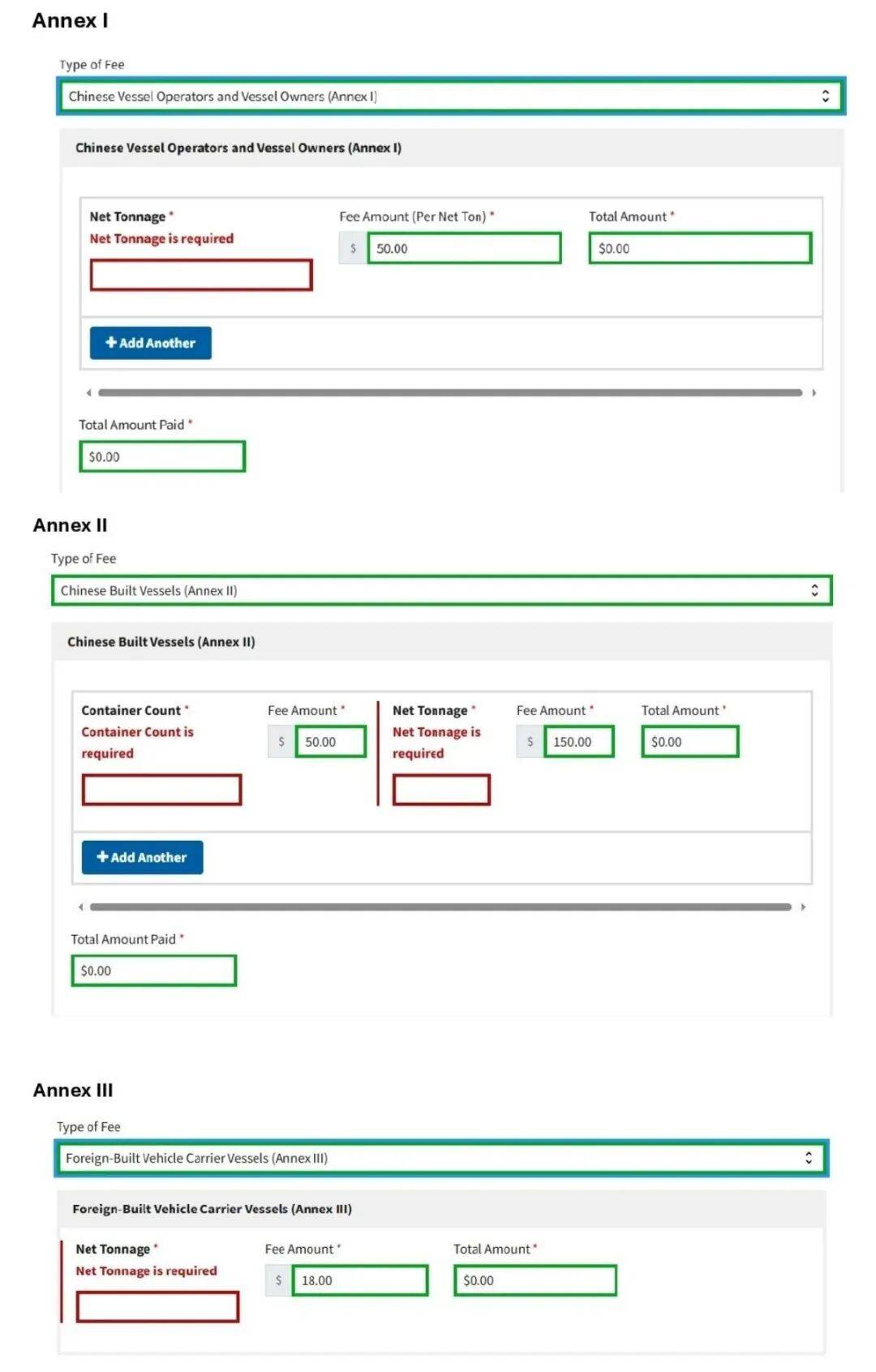 提交上述信息后,付款人需选择适用的费用类别(附件I、II或III),并按要求输入相关细节。支付完成后,信息将同步至美国船舶进出港系统(VECS);若匹配失败,可凭Pay.gov电子邮件确认证明付款。
