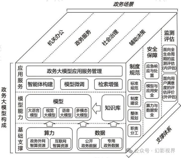 · 政务大模型构成:包括基础支撑(算力、数据)、模型能力(大语言模型、知识库)和应用服务(检索增强、智能体构建)。