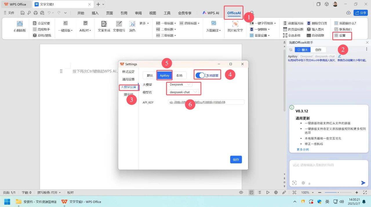 进入officeAI选项卡,点击设置,选择大模型设置,开启本地部署,点击APIKEY,大模型选择deepseek,模型名选择deepseekR1。