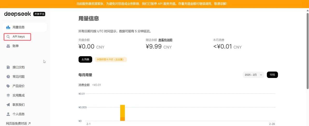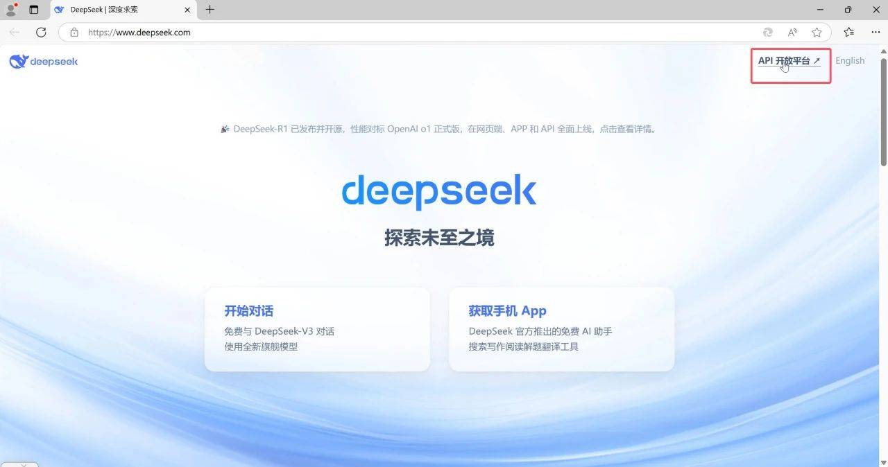 然后进入到deepseek官网申请一个apikey,之前apikey是关闭申请的,现在已经开放了,点击右上角API开放平台。