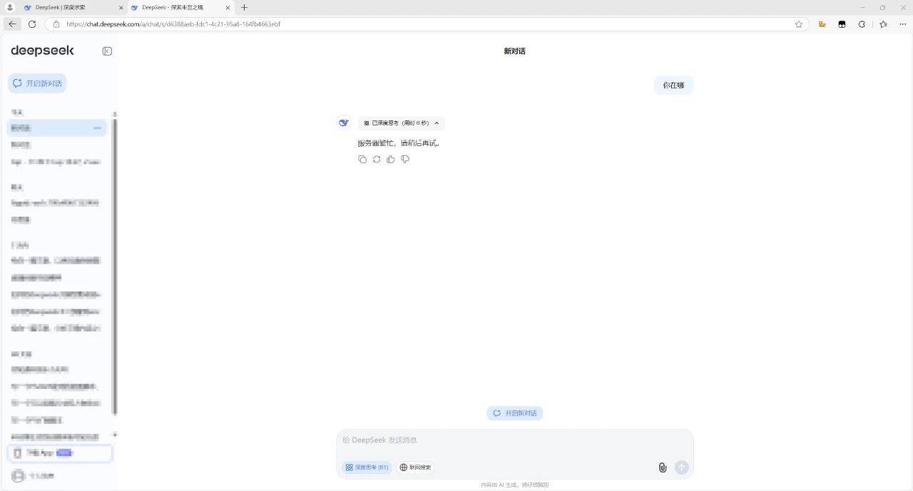 这个并不是部署的问题,因为deepseek现阶段还在遭受国外的攻击,再一个就是使用的人太多,所以会出错,在官网使用也是这样。