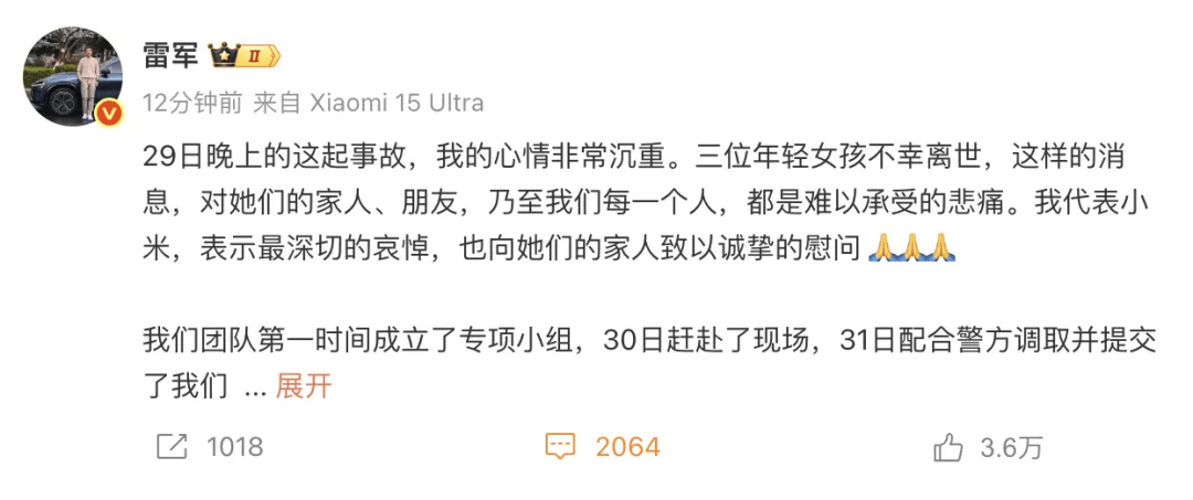 然而命运的转折来得猝不及防。3月29日,一辆小米SU7在高速路上发生碰撞后爆燃,三人不幸遇难。事故发生后,公众对智能驾驶安全性的质疑如潮水般涌来,雷军72小时的沉默与后续回应被指“迟缓而空洞”。他被推至风口浪尖,小米股价应声大跌。
