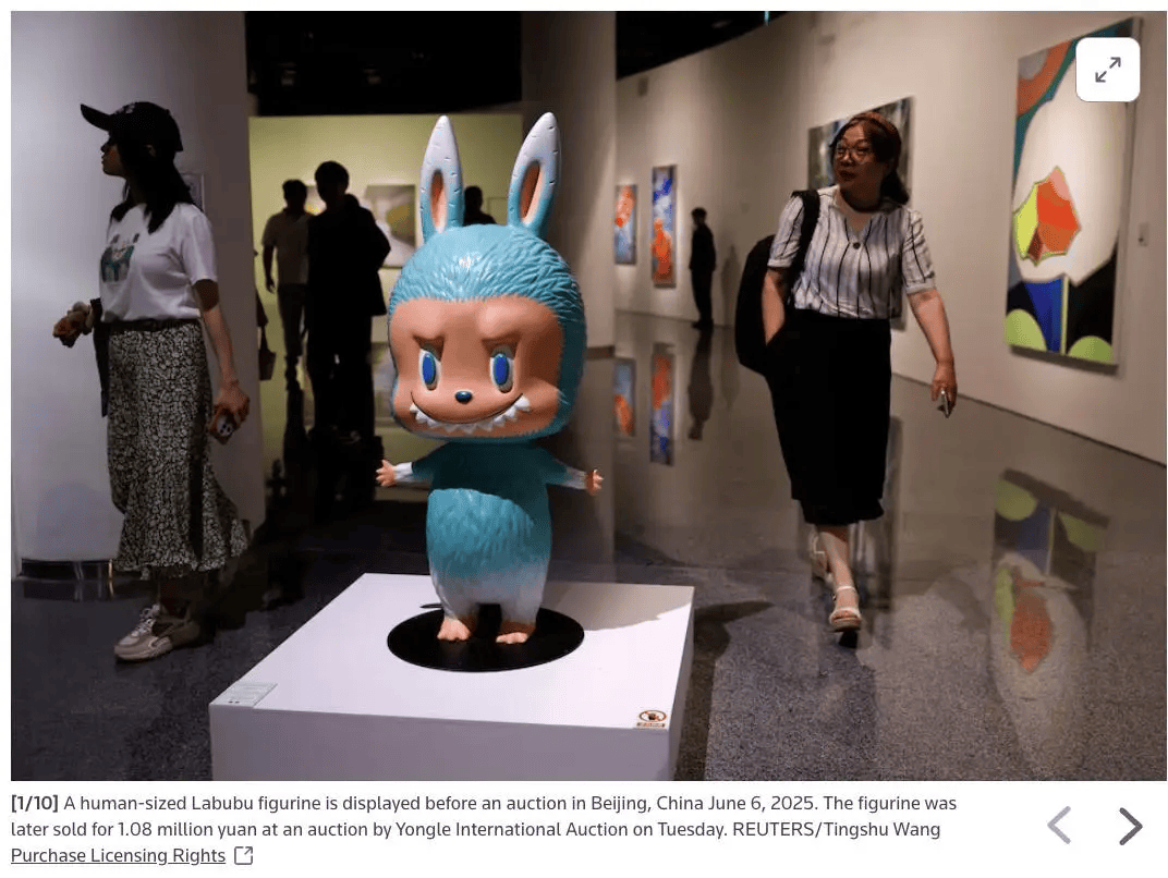 6月10日,一只薄荷绿色的拉布布玩偶在永乐春拍中以108万元落槌,刷新潮玩拍卖纪录。这只尖牙咧嘴的小怪兽,以破竹之势席卷全球,成为年度文化现象。