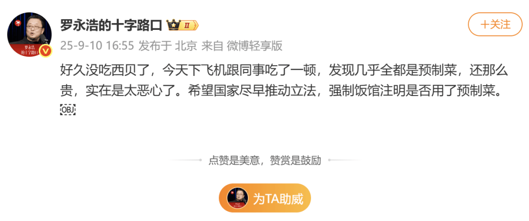 “几乎全是预制菜,还那么贵,实在太恶心了”,罗永浩关于西贝预制菜的吐槽,点燃了9月的商业舆论场。这不仅是他与餐饮巨头西贝贾国龙之间的个人交锋,更演变为一场关于消费者知情权、行业标准与商业伦理的全民讨论。