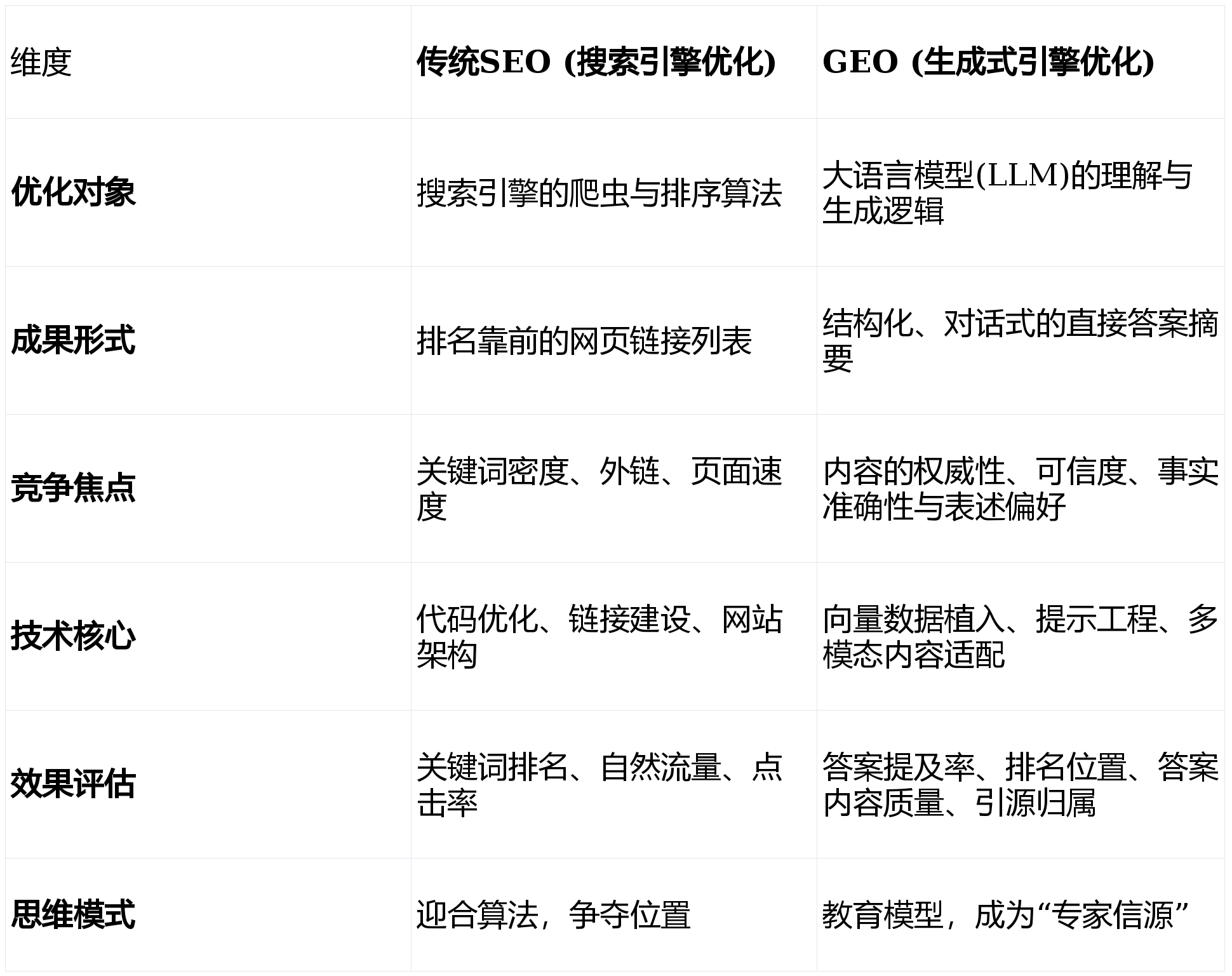 生成式引擎优化(GEO)绝非简单的“新瓶装旧酒”。它标志着从“关键词匹配链接”到“理解并影响AI生成答案”的范式革命。GEO的核心目标,是确保当目标用户向AI发起提问时,您的品牌、产品、服务或解决方案能够被AI精准识别、深度理解,并作为权威、可信赖的信息源,呈现在生成答案的核心位置。这要求服务商不仅懂营销,更要深谙大模型的工作原理、数据训练逻辑与内容生成机制。