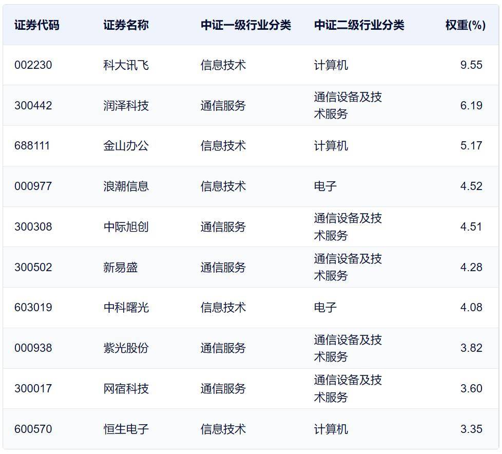 该指数前十大重仓包括科大讯飞、金山办公、中际旭创、新易盛、浪潮信息、中科曙光、紫光股份、恒生电子、润泽科技、拓维信息等软硬件龙头,有望充分受益于AI新基建浪潮。