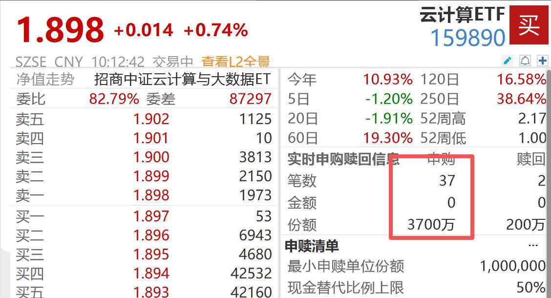 资金面热度持续攀升。据Wind Level2实时行情结合均价预估,截至发稿,云计算ETF(159890)盘中净流入超6600万元,近5日累计获净申购约5890万元,规模累破前高。