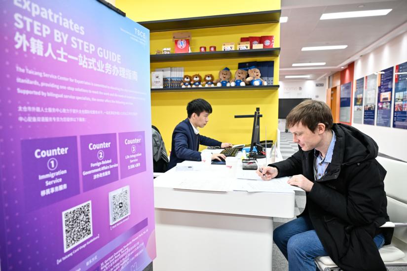2月25日,在太仓市外籍人士服务中心,一名德企员工在办理业务。(图片来源:新华社)