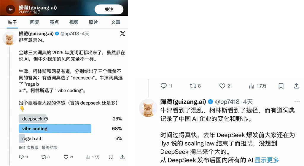 巧的是,牛津词典也于上周同期公布了2025年度词汇,这一契机让不少海外博主顺势展开对比解读,其中一位海外博主点评道,“牛津看到了‘混乱’,柯林斯看到了捷径,而有道词典记录了中国AI企业的变化与野心。”