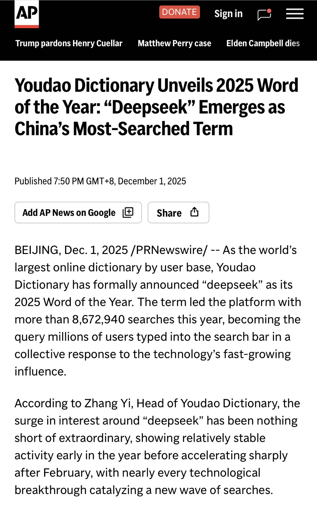 不仅如此,等海外权威媒体也对“有道词典年度词汇”事件予以关注。在报道中指出,该词2025年在有道词典内的搜索量高达8672940次,作为全球用户规模领先的在线年起持续发布年度词汇,依托全球超10亿用户的真实查词行为数据,具有广泛的公众代表性。